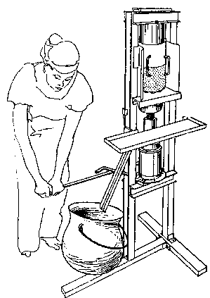Cage presses have formed the basis of many small-scale processing operations in recent years and are sometimes called screw presses, but this name should be avoided as it can be confused with the continuous screw expeller. There are a number of cage press designs and four types are shown in Figures 6-9. In a variation of the version shown in Figure 9, the hydraulic jack is mounted above the pressing cage. This design is not recommended because of the risk that leaking hydraulic fluid could contaminate the oil and cake.