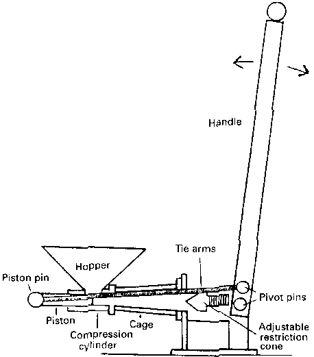 The prototype ram press was designed in 1985 by Carl Bienlenberg, an engineer working with Appropriate Technology International (ATI). The layout of this press is shown in Figure 10. A long, pivoted lever moves a piston backwards and forwards inside a cylindrical cage constructed from metal bars spaced to allow the passage of oil. At one end of the piston's stroke an entry port from the seed hopper is opened so that seed can enter the press cage. When the piston is moved forward, the entry port is closed and the oilseed is compressed in the cage. As a result, oil is expelled from the oilseed and emerges through the gaps in the cage. Compressed seed is pushed out through a circular gap at the end of the cage. The width of this gap, which can be varied using an adjustable pressure cone, controls the operating pressure of the press. The design of the press is such that it can achieve operating pressures greater than those obtained in most manually-operated cage presses, and as high as those in small expellers. The ram press has a low seed throughput but has the advantage of continuous operation.