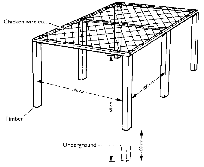 Figure I shows a rack with a flat top. To make the rack, 160 cm lengths of timber should be cut. These are then buried in the ground to a depth of about 60 cm. They are arranged about 100 cm apart in two lines, the distance between the posts being the width of the drying rack. Lighter pieces of wood or bamboo are fixed between the top of the posts. Material, such as chicken wire, mosquito netting, old fishing nets, reeds or coconut matting, is then fixed to these canes to support the fish.
