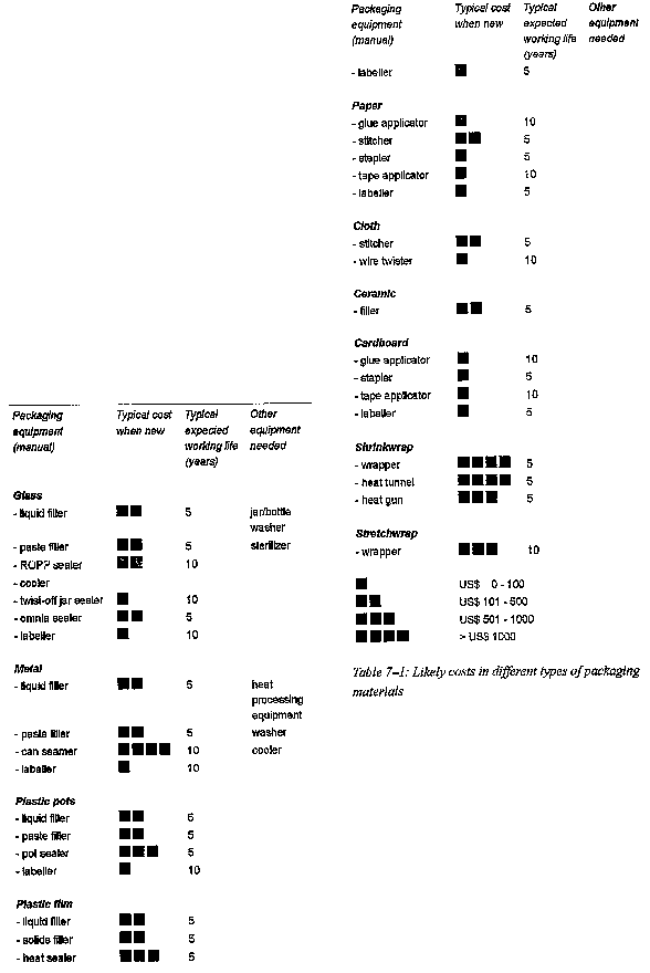 An indication of the range of likely costs involved in different types of packaging equipment is shown in Table 7-1. However, it should be noted that the cost of packaging equipment depends on similar considerations to the cost of other types of processing equipment (for example type and size of equipment, degree of complexity required, materials of construction, country of origin, etc) and it is not therefore possible to be more specific about the costs of individual equipment. Similarly the expected life of packaging equipment will vary according to the type and method of manufacture, the production rates used, the amount of maintenance given and the working environment. Depreciation costs will therefore also vary widely.