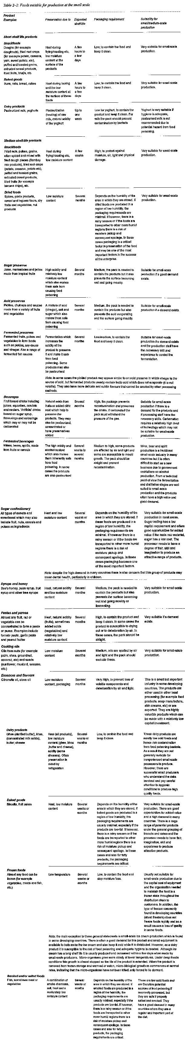 Taking these and other factors into account, Table 2-2 shows the foods that are commonly seen as suitable for production at the small scale. Short shelf-life products are those that are expected to be eaten within a few days of production. In general the following short shelf-life products are suitable for small-scale production because there is a good opportunity to add value to low-cost raw materials. There is often a good demand for such products and there are fewer packaging and distribution problems than occur with some other foods.