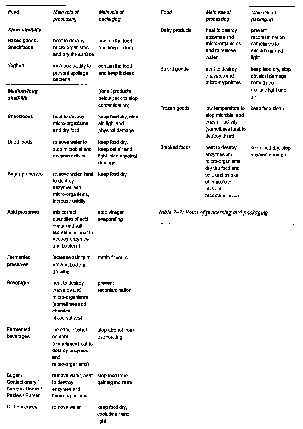Another main function of packaging is to minimise these types of physical damage to foods during transport and storage. This type of packaging is often known as a shipping container and these are described in more detail in Chapter 4. A summary of the different roles of processing and packaging to prevent deterioration described above is shown in Table 2-7. The factors that affect the shelf-life of foods and the protection offered by different packaging materials are shown in Table 2-8.