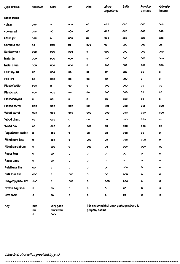 It can be seen from Table 2-9 that the benefits of packaging are substantial for some dried products, particularly in humid areas where the package should provide a barrier to moisture. Many dried foods are susceptible to rancidity and for these a barrier to air and light is needed. Many dried foods are also fragile and easily broken. They are therefore packed in cartons or boxes to give protection against mechanical damage. Products stored in dry areas do not benefit from an extension of shelf-life by packaging and the pack is simply used to contain the food and keep it clean.