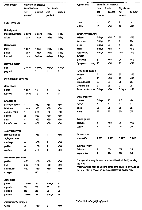 In the following section the actual extension of shelf-life for different foods is shown for two types of climate. Readers should note that the data given is indicative only and that shelf-life will vary according to the local storage conditions used. Table 2-9 indicates the likely extension of shelf-life of the foods to be achieved by proper packaging.