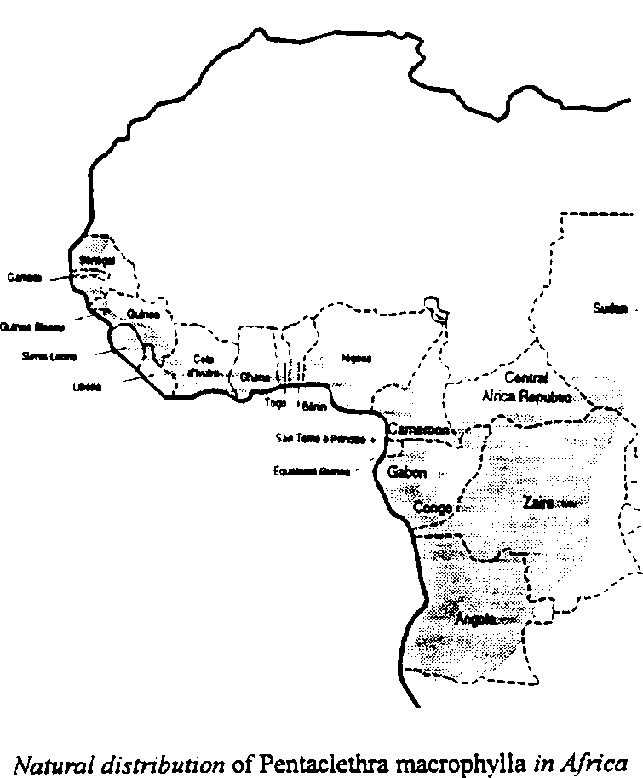 Pentaclethra macrophylla occurs from Senegal to Angola and also to the Islands of Principe and Sao Tome. This multipurpose tree is endemic to the humid and some parts of the sub-humid zones of West Africa. It does not occur in the highlands although, growth can be good where rainfall is adequate and temperatures are never cooler than 18°C. The annual mean temperature requirement is about 25°C and rainfall between 1000-2000 mm. After about 2-years growth in the forest, trees become relatively fire resistant and resprout readily when lopped.