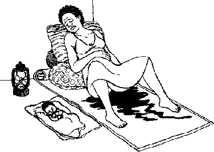 Haemorrhage after the birth of the baby (postpartum) is always a serious problem. If bleeding has not stopped half an hour after the placenta has come out, or if it is severe (more than two cupfuls), the woman should be taken to a hospital as quickly as possible since she needs urgent attention (see Figure 11.7). Normal postpartum flow is similar to that of a heavy menstrual period. Postpartum haemorrhage can be due to a number of causes: