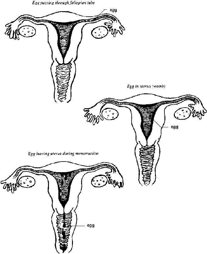 Each month, a mature egg is released from one of the ovaries; this is called ovulation. Once released by the ovary, the egg moves into the fallopian tube (see Figure 4.2). The egg can survive for only about one day (24 hours) in the fallopian tube. If it is not fertilised by a sperm within that time, it dissolves or flows out of the body.