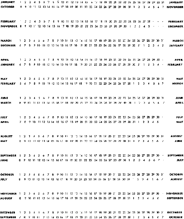 The calculation is made from the first day of the last menstrual period. In each row, the top line of figures represents the first day of the menstrual period; the bottom line of figures represents the corresponding expected date of delivery.