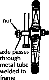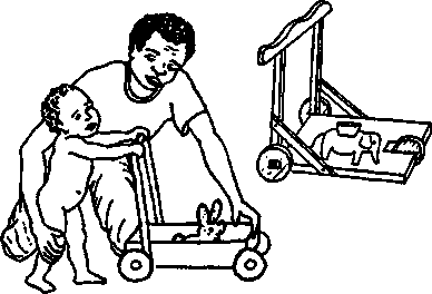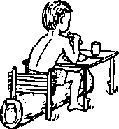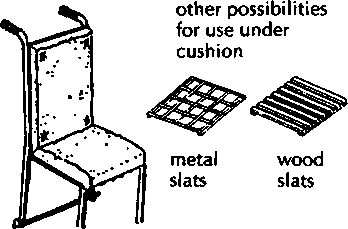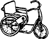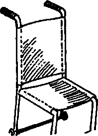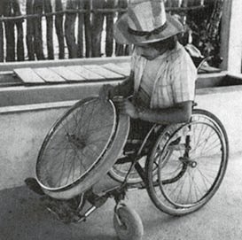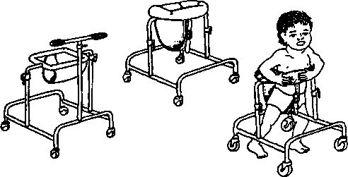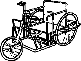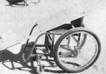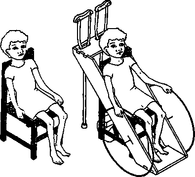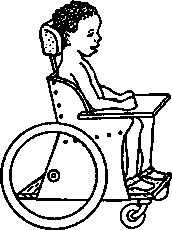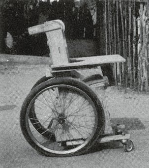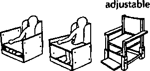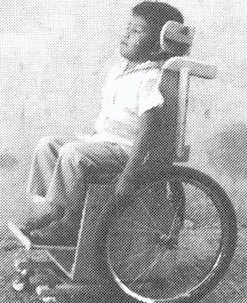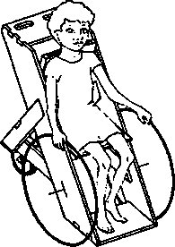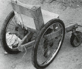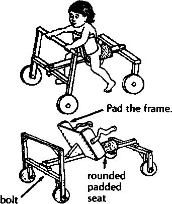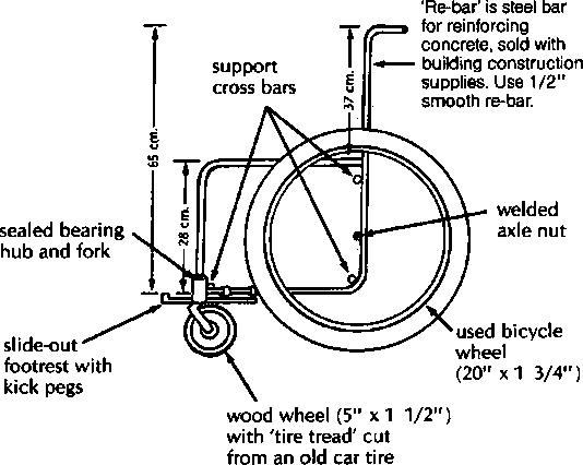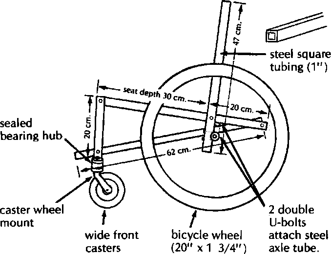 A simple wood or plywood chair can be easily made to fit the childs size and positioning needs. Repairs and replacements are easy because bicycle wheels and other standard parts are used.
