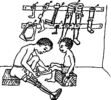 This method uses flat metal bars, a wood post, and a thick, firm leather socket. To form the socket, wet leather is stretched over a plaster mold of the stump. Methods are clearly and simply described in Simple Below-knee Prosthesis Manufacture.
