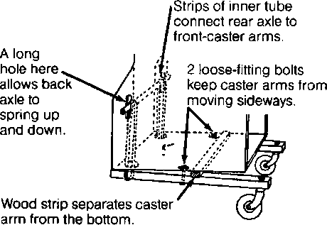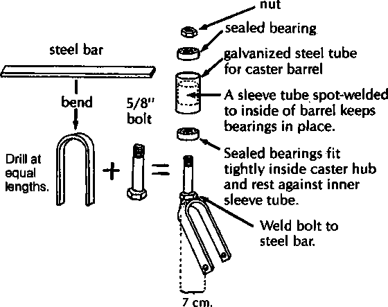 5. Drill hole in post and attach bolt with wire (to lock knee straight, when necessary). 6. Ledge prevents knee from bending backward. Small strip of y car tire acts as cushions