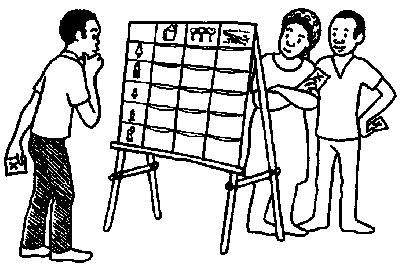 Le degré de réussite varie selon les cas. Certaines communautés seront peut-être en avance sur le programme, d'autres se seront heurtées prématurément à des difficultés. Tout indice tangible d'amélioration doit inciter la communauté à poursuivre ses efforts. Les gens ont besoin de voir les résultats de leur travail faute de quoi ils perdent confiance dans ce qu'ils ont appris et en eux-mêmes. En tant qu'animateur, vous pouvez contribuer à empêcher cette perte de confaince en aidant le groupe à identifier les améliorations, aussi faibles soient-elles. Au besoin, vous pouvez utiliser les activités que vous connaissez bien pour relancer le processus. Ainsi, vous aiderez le groupe à cerner les problèmes qui ont entravé sa progression, à les analyser, à prévoir des solutions, choisir des options, élaborer un nouveau plan, attribuer des tâches, surveiller et évaluer enfin les résultats.