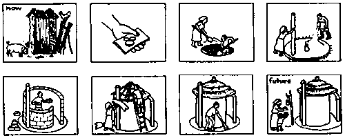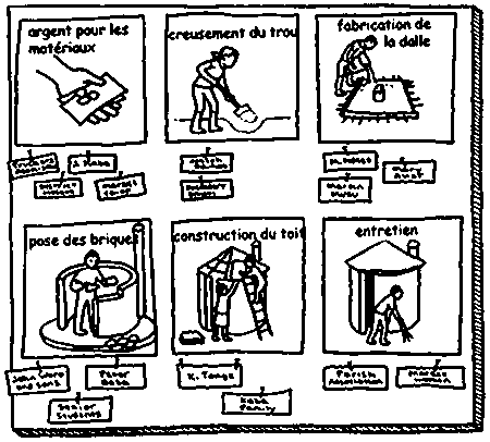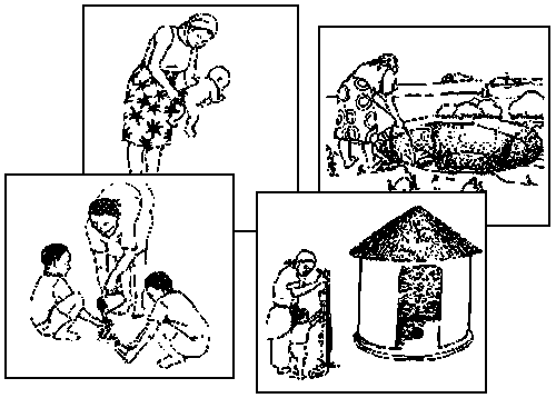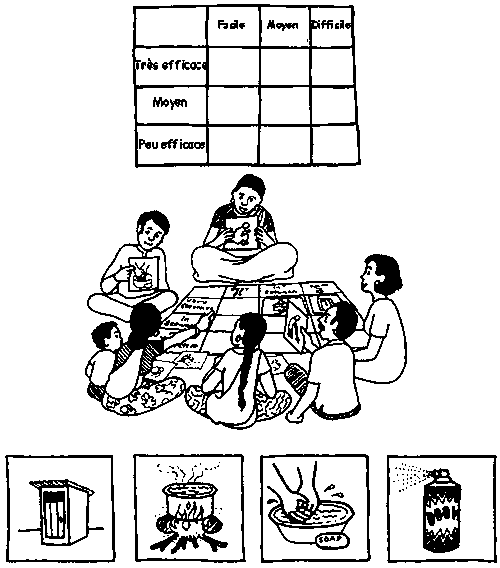 8. Si le groupe n'a pas présenté de problèmes en rapport avec l'eau et l'assainissement, essayez de répéter l'activité en utilisant un jeu d'illustrations moins générales, plus directement en rapport avec les questions de santé et d'assainissement. Jouez votre rôle d'animateur comme précédemment.