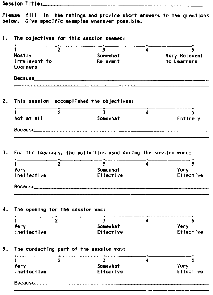 Distribute several copies of Handout 19E (Evaluation of Practice Session) to each participant. (Each person should have as many copies as there are practice sessions.)
