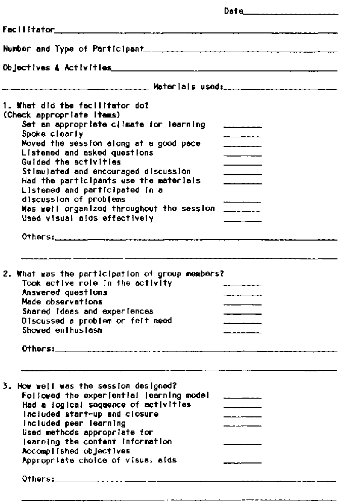 It is always helpful to try out a planned session with a group willing to offer suggestions about what is good about the activity and what could be improved. Peer critiques also are a means of sharing ideas and approaches that can be used by all the participants when they return to their work sites. Conducting health education sessions also gives participants a sense of accomplishment and a moons to assess what they have learned about health education in the post few cloys. Finally, it provides practice in giving constructive criticism. In this session, co-facilitators present their project plans end conduct the health education session that they planned earlier in the training. Following each session the participants evaluate their peers' work.