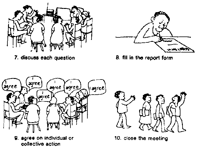 David, a health volunteer, talked with the village health committee about the health needs of the community. The committee members said that nearly everyone in the village wanted a health post because the nearest post was a four hours walk away. They insisted that if they could get the money to buy supplies, the villagers would provide the labor to build the health post. David promised to help. He went to the Ministry of Public Works and found the section that gives loans for village construction projects, de got the request forms for the loan and helped the health committee fill them out. Then he returned Jo the ministry and collected the loan for the committee.