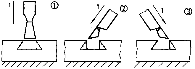 (1) recessing of a rectangular groove, (2) machining of an inclined surface, (3) machining of the opposite surface, 1 feeding movement