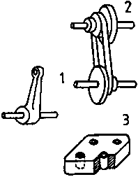 levers and cranks on shafts, toothed gears and pulley on shafts, bushes in bases (housings).