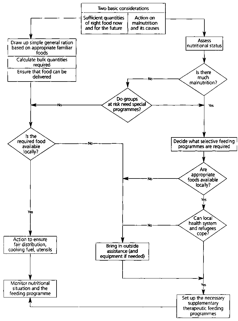 1. In an emergency, refugees may be completely dependent on external food sources. An initial assessment of their health and nutritional condition and their numbers must be made as soon as possible. The types of programmes needed will be determined by this initial assessment. Continuous monitoring of nutritional status will ensure that the emphasis on different programmes can be adjusted in order to reflect changing conditions.