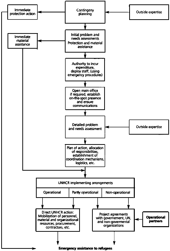 4. Figure 1 shows some of the considerations discussed in this section in diagrammatic form, in particular in relation to emergency response. The response activities of problems and needs assessments, operations planning, implementing arrangements and programme formulation are all very closely related. Some aspects treated separately may be indivisible in practice, and there is no single correct order or way in which an emergency operation should be formulated (but it must conform to established UNHCR procedures governing project submission and control).