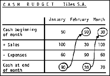 At the beginning of January there are LU 50.- in the cash box. The incoming cash from selling products is estimated to be LU 100.-, the cash flowing out of business through expenses is estimated to be LU 60.- Therefore, at the end of January there are still LU 90.- in the cash box. LU 90.-, however, is the amount of cash present at the beginning of February, and so on.