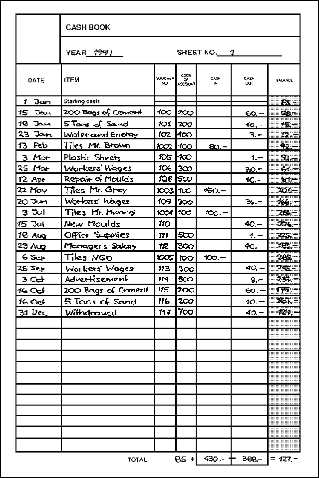 · Code of account. One purpose of the cash book is to keep control over the cash situation. Another purpose is to prepare the data for the profit and loss statement (see module 5), which allows you to analyse the financial situation of your workshop. In order to relate the cash transactions to the positions of the profit and loss statement, every position of the profit and loss statement is identified with a code and all cash transactions which correspond to that position receive the same code.The coding system used in the profit and loss statement of module 5 looks as follows: