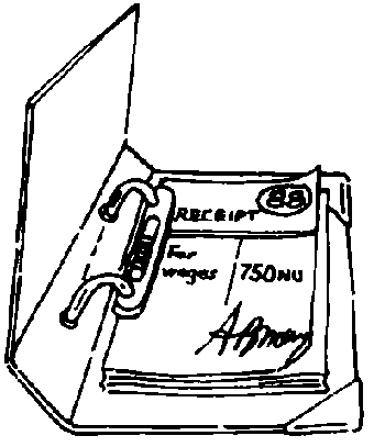 In this book you make notes about your employees: names, wages, advance payments and so on. Wages books can be bought from a stationery shop. When you pay your employees' wages, ask them to sign a receipt. Keep the receipts in the voucher file.