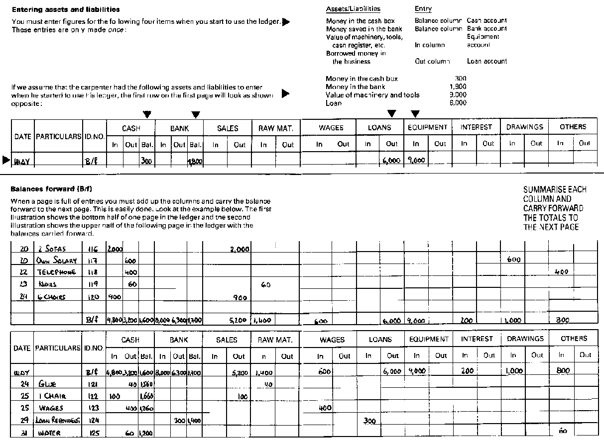 At the end of a month you must add up each column and carry forward the balance of each account to a new page in the ledger. See how it is done in the example above.