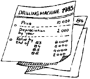 It is advisable to keep records of your machines and equipment in a book. The main purpose is to give you information you need for management accounting. The inventory book provides you with information about the present value of your machines and equipment. Each year you should subtract some money from the value because the equipment wears out. Subtract one-fifth of the value each year. After five years of use the value in your inventory book will be nil. This reduction in value each year is called "depreciation" (seethe management accounting section of Improve your business).