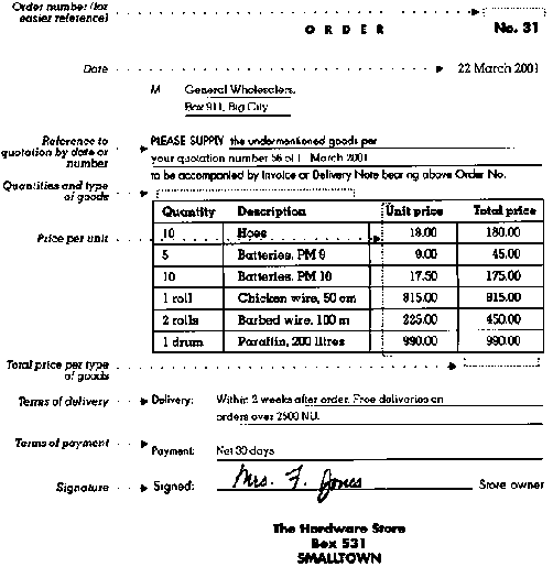 If the supplier does not have order forms, write your own. You can use a standard order book which you can find in many shops, or make a simple order form yourself. Send the original to the supplier, but remember to keep your copy.