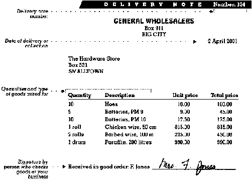 If you collect the goods or materials yourself, immediately check the type and quantity before you take the goods or materials away. If the goods or materials are delivered, the supplier usually sends a delivery note with the goods or materials. The delivery note lists details of the goods. The supplier wants you to sign the delivery note as proof that you have received the goods. Always check that you have received the right type and quantity before you sign the delivery note.