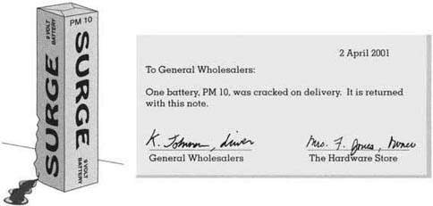 1. The invoice includes the cracked battery PM 10 that The Hardware Store returned to the supplier with the note of complaint signed by the delivery person. 2. After they found the mistake, The Hardware Store immediately contacted the supplier and explained the problem. They told the supplier about the note they sent with the delivery person and discussed with the supplier how to solve the problem. |