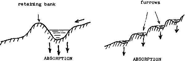 On land which is very permeable, where water is easily absorbed, RETAINING RIDGES are constructed to allow total infiltration of the water.