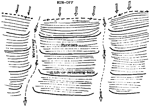 Ploughing and crop-tilling following the contour line of the slope reduce the flow of water and encourage its infiltration. Ditches and ridges built along the contours stop the flow of water and allow it to be absorbed. Waterways and channels divert excess water.
