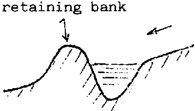 Where land is much less permeable, the same structures are used to retain the water for as long as possible but with the addition of a waterway to divert part of the surplus water.