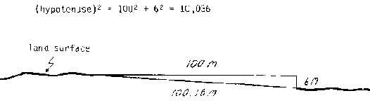 If a field has a 6 percent slope in the direction where elevation changes most rapidly, there will be a difference in elevation of 6 meters vertically to 100 meters horizontally. Note that the longer distance is horizontal, not inclined parallel to the surface of the land. On moderate slopes, it would make little practical difference whether distance were measured horizontally or parallel to the land surface. Figure 7-1 shows the distances and relationships on a slope of 6 percent. With a horizontal distance of 100 m and a vertical distance of 6 m, the inclined distance is the hypotenuse of a right triangle. The square of the hypotenuse of a right triangle is equal to the sum of the squares of the other two sides, hence