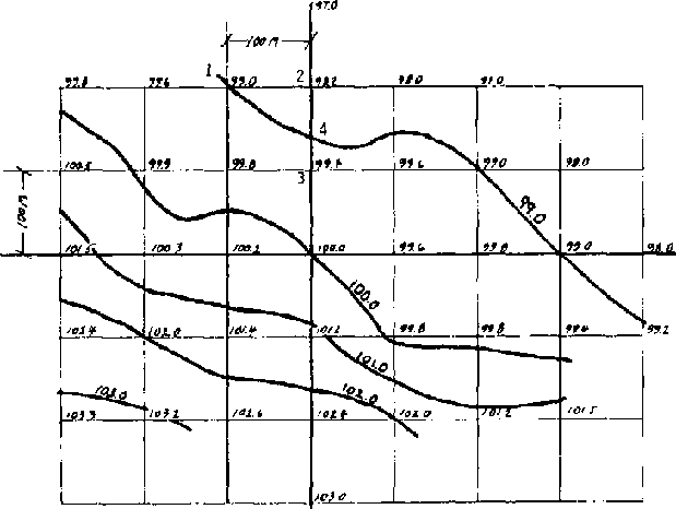 Figure 7-2 is a topographic map of a rectangular map of a rectangular field. The bench mark on the map was located at the approximate center of the field and assigned an elevation of 100.0 m. After two coordinate lines were constructed at right angles through the bench marks, the corners of the squares were located from the two coordinates.