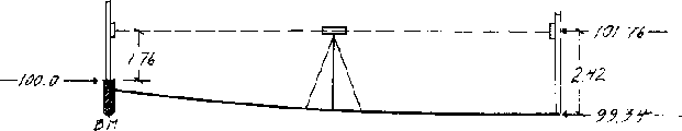 Figure 7-6 shows a survey that covers a longer distance where the elevations at several points between the benchmark, "BM" and a final point "A" are determined. A survey made in steps is required if there is a visual obstruction between the beginning and end points or when the difference in elevation is great.