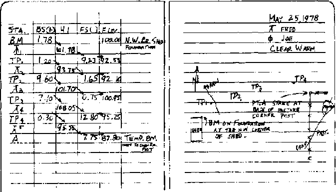 Figure 7-7 shows a typical set of surveying notes for the survey in Figure 7-6. (Note, this example is in feet rather than meters.)