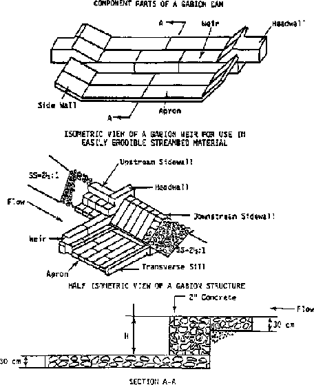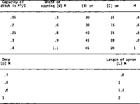 If the natural slope from the source to the point of use is very steep, it may be difficult to keep the velocity low enough to prevent erosion. A possible solution is to provide, at appropriate intervals, steps that will lower the water from one level to the next (Figure 9-5). The slope of the channel between the "steps" may be kept to a value that will prevent erosion. The steps may be made of wood or masonry materials. The flow velocity will be very high just below the structure and will cause severe erosion on the lower side. An apron must be provided to dissipate the energy in the falling water as shown in Figures 9-6 and 9-7. Table 9-4 shows the dimensions of a typical drop structure as shown in Figure 96(b).