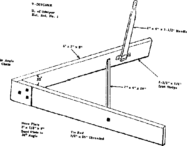 In ditch construction, the V-Ditcher operates quite like an oversized moldboard plow. After a channel line is laid out with surveying instruments, a moldboard plow is used to make a furrow on the line. Then the V-Ditcher is pulled back and forth in the furrow until a symmetrical ditch the size and proportion desired is formed.
