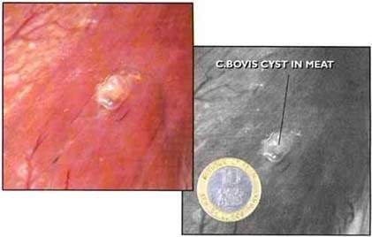 CYSTICERCUS BOVIS. This worm is found as small, rice-grain-like cysts in the meat of cattle. Cattle are the intermediate hosts and when these cysts are eaten by man, they develop into an adult tapeworm in the human intestine. The cysts are thought to cause no pathogenic or production losses in the cattle. However, where cattle are sold through a reputable slaughterhouse, the carcase may be downgraded with subsequent loss of value. Control is by treatment of humans and prevention of contamination of pasture with human faeces.
