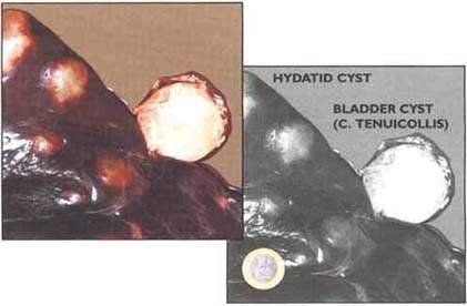 CYSTICERCUS TENUICOLLIS. This worm occurs as long, thin-necked, balloon-like fluid-filled cysts in the peritoneal cavity of domestic ruminants. Most commonly these are found attached to the surface of the liver, intestinal mesentery, other abdominal organs or the body wall. These cysts can be confused with hydatid cysts (see below). In this case the domestic ruminant is the intermediate host and the final host is the domestic dog (or perhaps wild canids such as jackals). The dog becomes infected by eating cysts in animal carcasses. The domestic animal becomes infected by eating eggs passed out by the dog. Since the dog may pass out many millions of eggs per day and these can be spread by flies, it is very difficult to control this infection. Treatment of dogs with praziquantel and preventing dogs having access to carcasses (or raw carcase trimmings) can reduce the incidence.