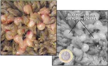 PARAMPHISTOMES. These flukes are often found in very large numbers in the rumen of cattle, sheep, goats and camels and are known as stomach flukes. Despite their large numbers, the adult worms are thought to cause little harm to the animal. However a sudden large intake of infectious stages can cause scouring, emaciation and death.