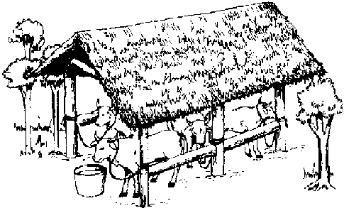 This shelter, built in the village near the owner's home, houses 10-20 animals. The roof is made of dried palmyra tree leaves (which are rainproof) or dried grasses. The posts are of bamboo, palmyra tree wood, teak, rose wood, or other strong wood. The floor is of mud. The animals are kept in the shed during the night and let out to graze in the forest during the day. The shed is cleaned and fresh mud is put on the floor before the animals return. The shed provides protection from the sun and rain, yet allows sufficient light and air to get in. It is very cool inside.