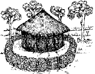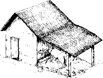 This shed is attached to the owner's house and is made of bricks, mud, wood or stone. It houses 1-2 animals. The roof is of dried wild hemp stalks or other grasses. The floor is of mud or brick, and it slopes so mud, dung and urine flow out. A feeding manger and a container for water are built in The shed obviously is well-ventilated and cool.