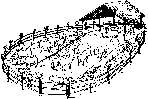 Farmers build a corral of trees, logs and wire. The animals rest inside the enclosure in a shed made of wood or bamboo, roofed with grass or leaves. This shed is built at the top of the slope, so water and waste materials run out of it.