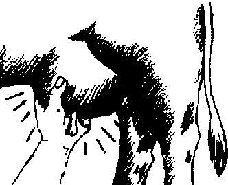 · Milking with the thumb inside the fist, touching the teat (see diagram in Decreased milk flow, page 141).