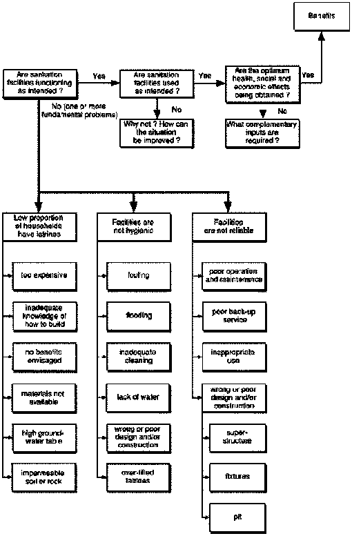 Evaluation of functioning, that is, determination of how well the different systems are working, can be considered in terms of the proportion of households in the target area who have constructed a sanitation system, and the reliability of the facilities (Fig. 11.3). Failure to reach at least 80% of the target population may be because the facilities are unaffordable or are not considered of immediate priority by the community in terms of expected benefits.