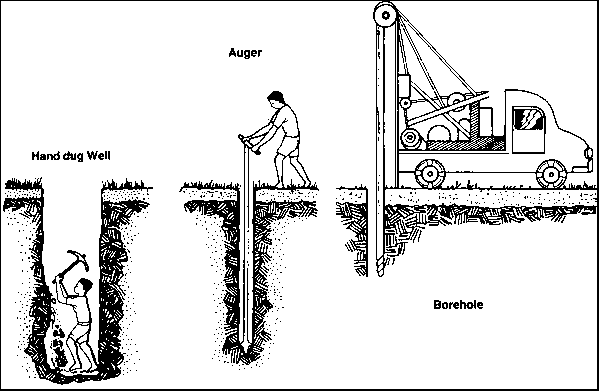 The water you get from a well has been stored in the aquifer. In order to get the water, a well had to be dug deep enough to reach the aquifer. The wells supplying ground water to your community were most likely dug (or drilled) in one of the following ways.